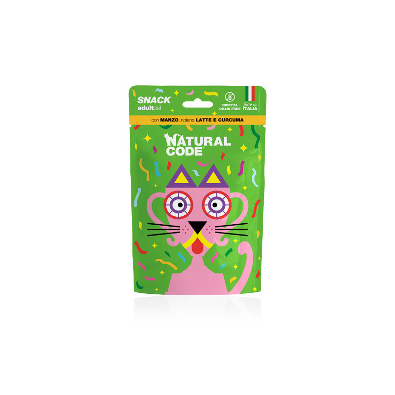 Snack manzo ripieno di latte e curcuma. Alimento complementare per gatti adulti